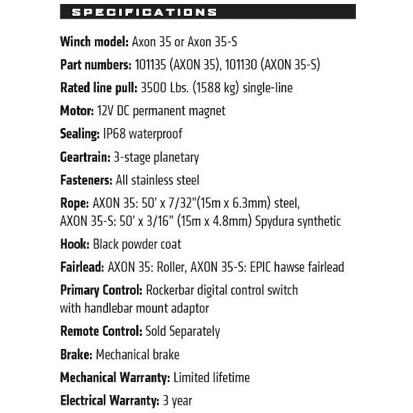 WARN's AXON lineup has taken winching to the next level by combining a powerful motor and first-of-its-kind digital contactor into one unit called a Motactor. The WARN Motactor increases performance, drops installation time, and provides never-before-seen levels of performance and feedback to the user. 50’ of 3/16” Spydura synthetic rope, Epic hawse fairlead, Rockerbar digital control switch with handlebar mount adaptor