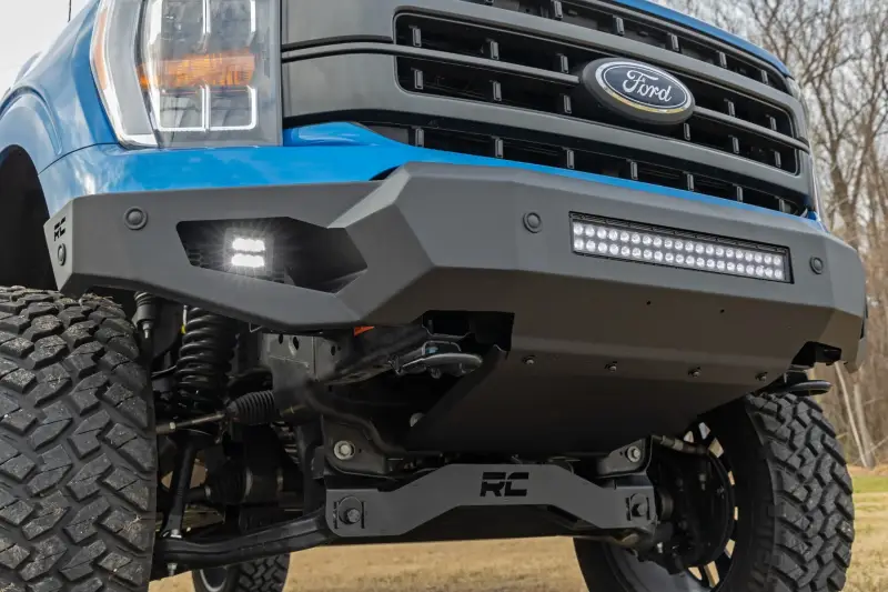 Aggressive Appearance. Give the front of your ninth-generation Ford F-150 an aggressive, new appearance with Rough Country’s Front High Clearance LED Bumper. This easy-to-install upgrade gives your truck an improved look and better protection, with a dual set of 2" LED Cubes and a 20" LED Light Bar that offers impressive off-road illumination!