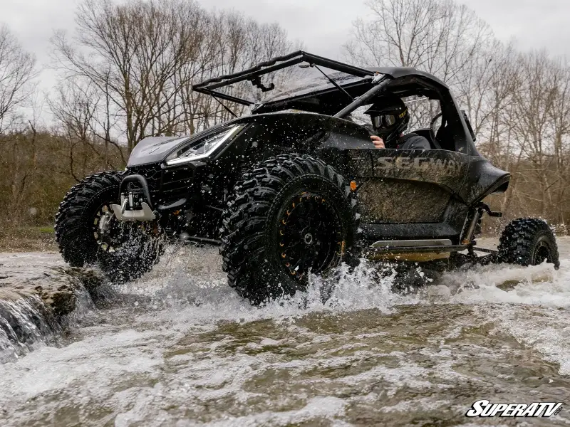 These beadlock wheels are built to go wherever you want. The aluminum alloy construction and double-spoke design give them a 1,400-pound load rating even thought they’re only 18.8 pounds each. That means you can load your machine up and hit the trail hard. Plus, the center cap bolts on, so it won’t come off easily.