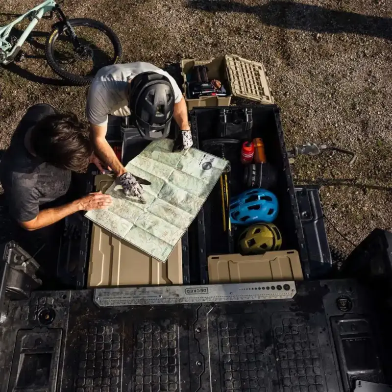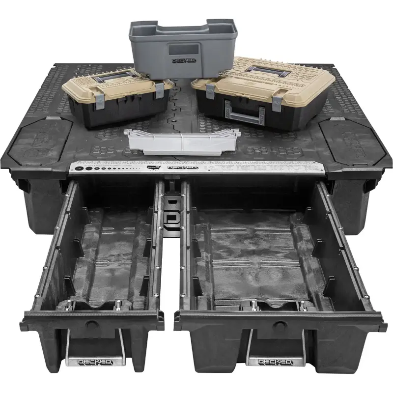 Providing secure, weatherproof and organized storage for full-size pickup trucks, the DECKED Drawer System features two lockable, full bed-length drawers capable of carrying 200lbs each. Evenly distributed, the system has a 2,000lb payload-rated deck. Each system includes: 1 Tan Sixer 16 D-Co case, 1 Tan Halfrack 32 D-Co Case, 1 vX Drawerganizer, 2 vX Drawer Dividers, 4 DECKED D-rings, 2 Deep Stash Bins & 2 Shallow Stash Bins.