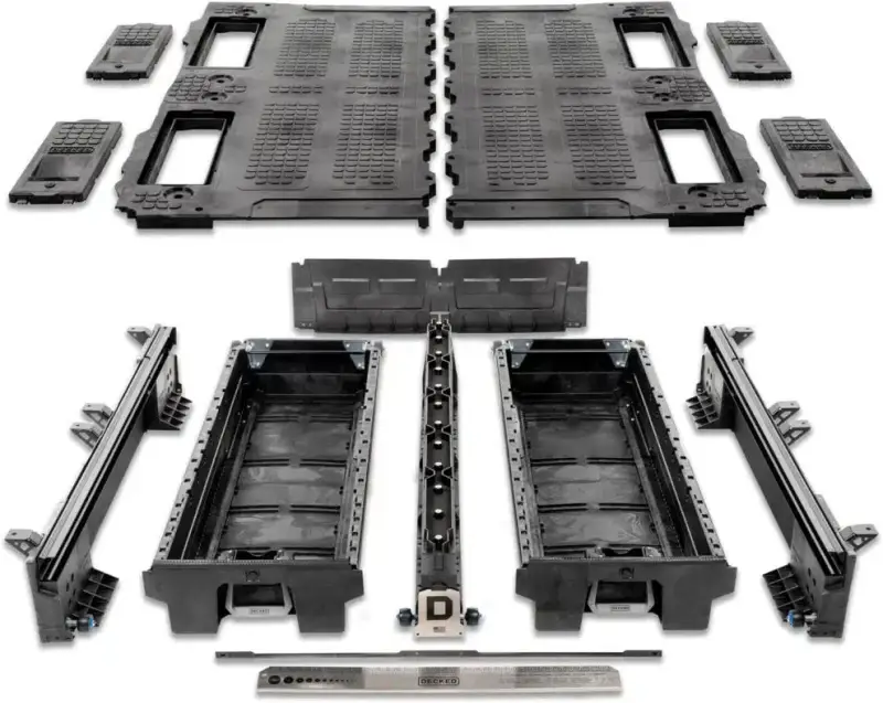 Decked systems are crafted from high-density polyethylene (HDPE) co-molded to galvanized steel subframes, making them super-rugged and strong. Decked products are designed to live outside in the elements; the exterior will be unaffected by extreme shifts in temperatures, moisture levels, or intense UV exposure. Dozens of models are available for precise fitment in your truck bed application.