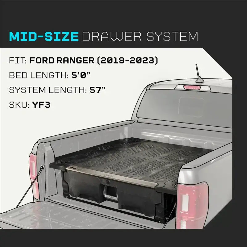 Providing secure, weatherproof and organized storage for full-size pickup trucks, the DECKED Drawer System features two lockable, full bed-length drawers capable of carrying 200lbs each. Evenly distributed, the system has a 2,000lb payload-rated deck. Each system includes: 1 Tan Sixer 16 D-Co case, 1 Tan Halfrack 32 D-Co Case, 1 vX Drawerganizer, 2 vX Drawer Dividers, 4 DECKED D-rings, 2 Deep Stash Bins & 2 Shallow Stash Bins.