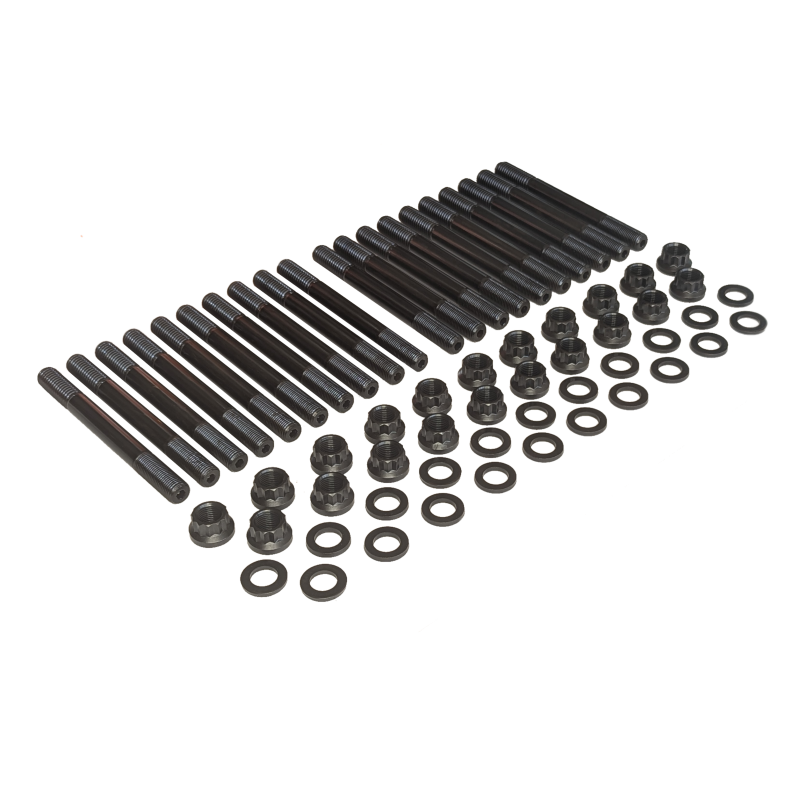 This is currently the only main stud kit designed specifically for the Ford IDI platform. Each kit is compatible with or without a girdle kit, making it ideal for custom engine builds. If you are installing the kit without a girdle, the oil pickup support bracket must be drilled to accommodate the larger main stud diameter. The corrosion-resistant black oxide finish ensures long-lasting protection, even in harsh diesel environments.