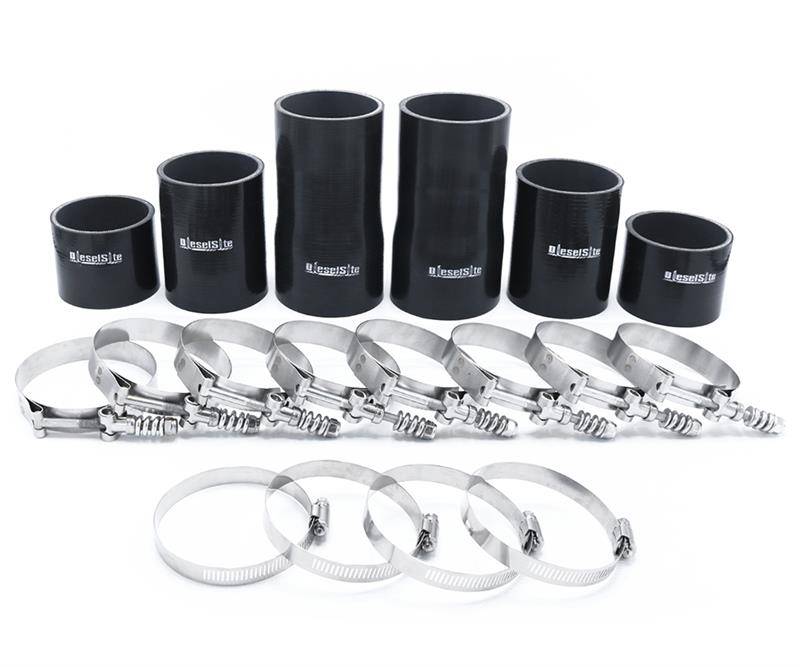 This complete kit includes the two boots that connect the intake manifold to the cylinder heads (intake plenum) on the top of the motor, the two boots that connect the intake manifold (spider) to the intercooler piping, and the two boots that connect the intercooler to the intercooler piping and all required clamps.