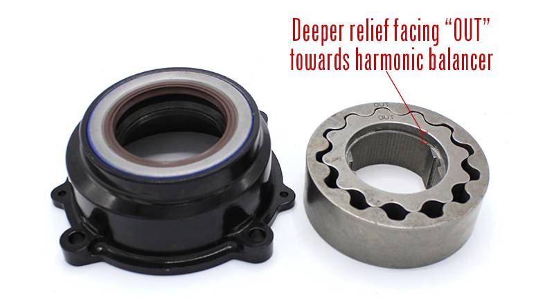 *The gears must be installed correctly! Inner gear marked "damper" or "out" side with the DEEPER RELIEF faces towards the balancer. Failure to do so will cause catastrophic damage to the front cover.
