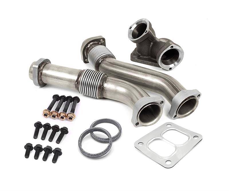 This Dieselsite (now in 409 Stainless Steel) up-pipe kit was designed to replace the poorly designed OEM standard equipment up-pipes and gaskets that typically leak. This design allows for expansion and contraction without stressing the actual gasket and is a direct replacement with no modifications needed.
