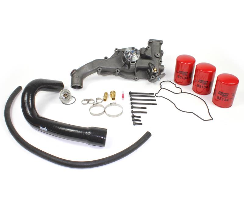 New 7.3L Ford Powerstroke water pump with Coolant Filter all in one! Finally a complete bolt-on system that utilizes the International cast iron water pump, with everything needed to fit the 7.3L Powerstroke.