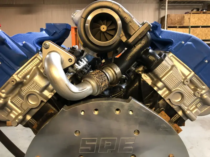 This turbo system does NOT require any extra components*. It can be used as a 100% drop-in replacement or as an upgrade. It uses the factory driver’s side manifold and an included, SPE designed, aftermarket passenger side manifold. This kit maintains the factory driver side up pipe (passenger side up pipe and manifold are no longer used), 2015+ style downpipe, 15+ lower intake manifold, and 11-19 upper intake manifold.