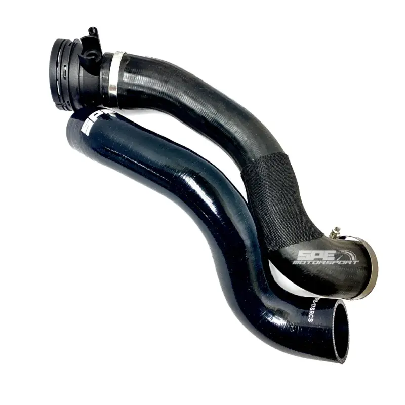 The SPE Motorsport cold side replacement hose is constructed from a 5-ply polyester reinforced silicone material that withstands higher temperatures and higher pressures and designed to outlast and outperform the factory hose. Thus, increasing reliability and durability.