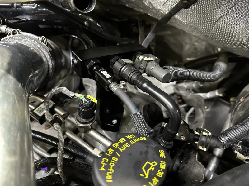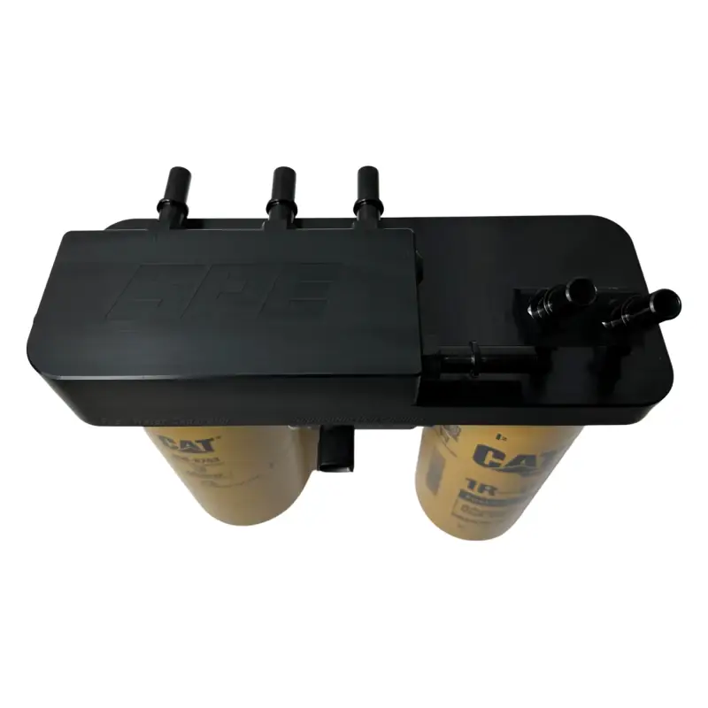 For the main filter side, SPE uses the CAT 1R0749 as the fuel filter which is 2 microns as opposed to the 4-micron factory filter, adding 3 times more filter area/volume and flow. The filter sizing and type were determined not only by filtration but also efficiency at high volumes of fuel flow for performance applications. This is something that should not be overlooked when your truck is making extra power. Now that the top filter is under the truck SPE provides a Fuel manifold to go in place of the stock filter. Utilizes all the factory lines and connections. Zero cutting or modifying. The manifold also adds auxiliary fuel ports. Not to mention it cleans up the top of the engine and makes it look and function better.