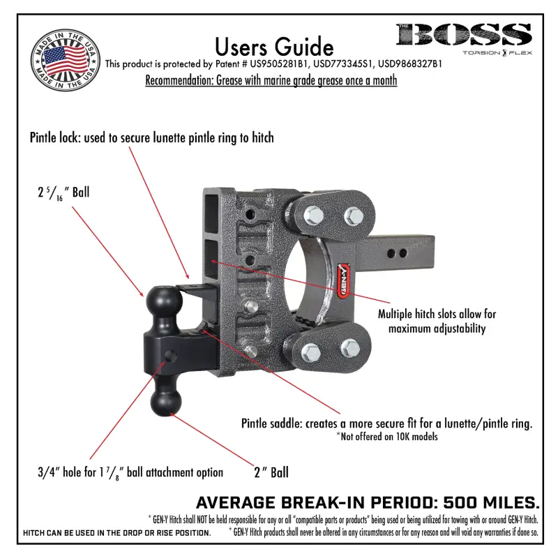 All GEN-Y Hitch products are rigorously tested and exceed the SAE-J684 Weight Testing Requirements. Never exceed recommended capacity on any trailer tow coupling or vehicle receiver hitch. Patents protecting the GEN-Y Boss (Torsion Flex) 10K drop hitch include #(s) US9505281B1, USD773345S1, USD9868327B1