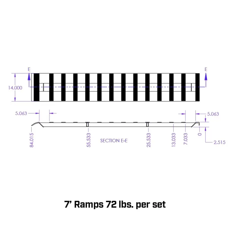 •7′ Ramps: 84″ Long x 14″ Wide x 2″ Thick