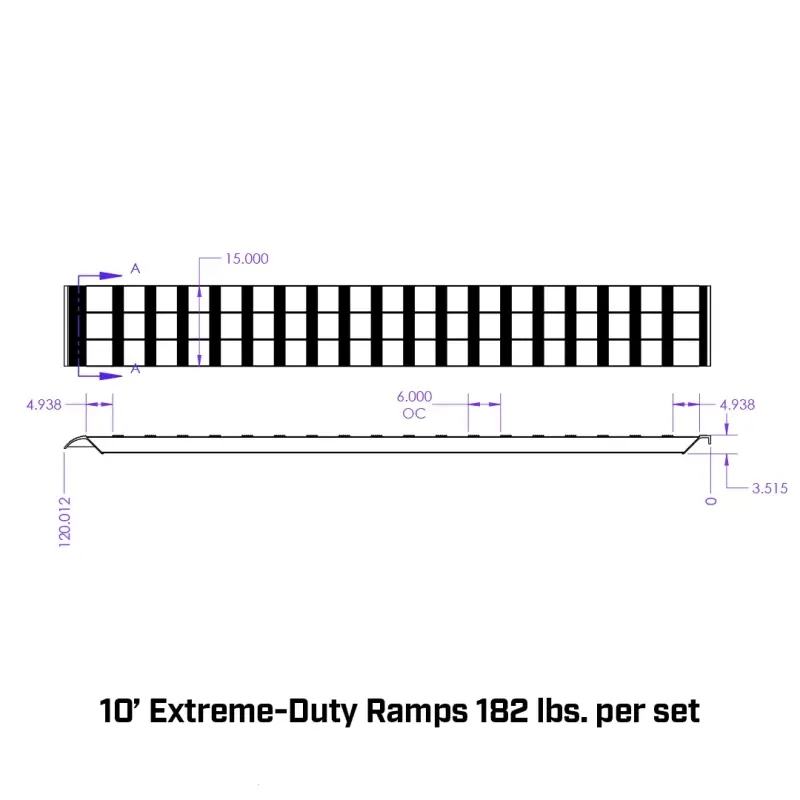 •10′ Ramps: 120″ Long x 15″ Wide x 3.5″ Thick