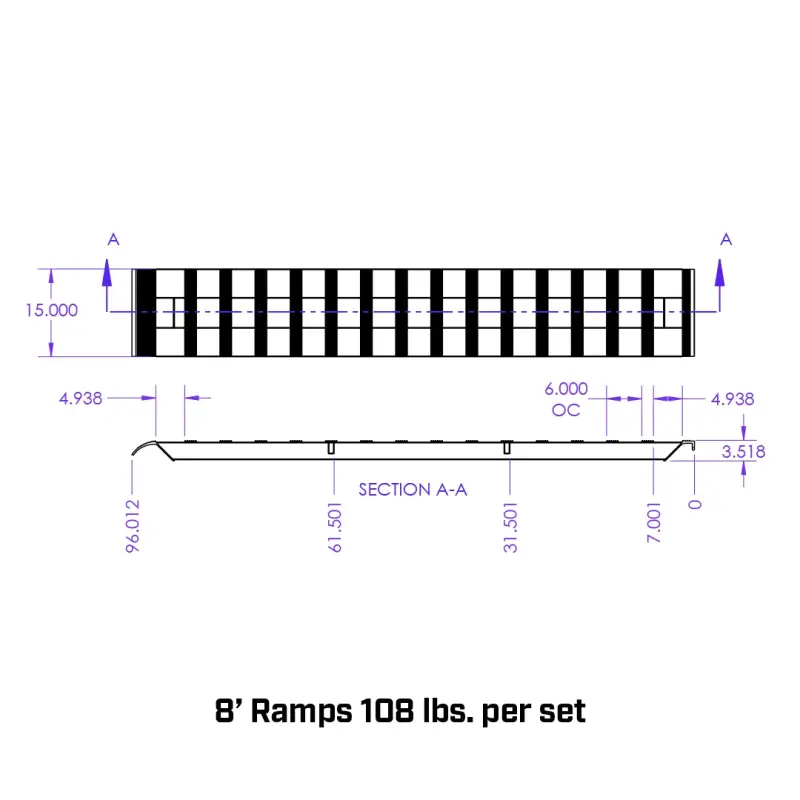 •8′ Ramps: 96″ Long x 15″ Wide x 3.5″ Thick