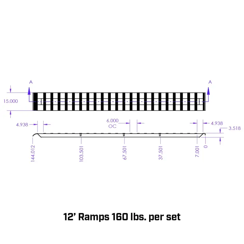 •12′ Ramps: 144″ Long x 15″ Wide x 3.5″ Thick