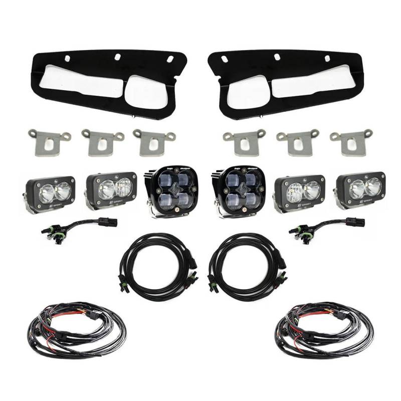 Kit Includes: (2) S2 Sport Spot (2) S2 Sport Driving Combo (2) Squadron SAE, Spot in Clear or Amber (2) Left and Right side fog light facia mounts (2) Upfitter Wire Harnesses (640093) (2) 55 Splitter (613606) (2) Splitter (613607) All Necessary hardware and parts bags.