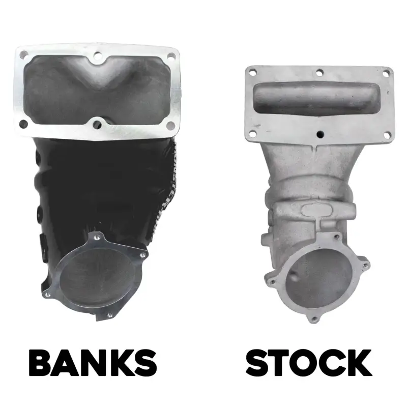 Utilizing the latest in CFD (computational fluid-dynamics), tested on the flow bench, the dyno, and on-road, Monster-Ram is a beast that only Banks could have unleashed. A direct-replacement aluminum casting, Monster-Ram is instant power, performance, and acceleration gratification. The factory inlet elbow is cramped and angular in order to accommodate the path of the stock No. 1 fuel line. Banks Engineers designed a new No. 1 fuel line, allowing the Monster-Ram to flow more air without obstruction.