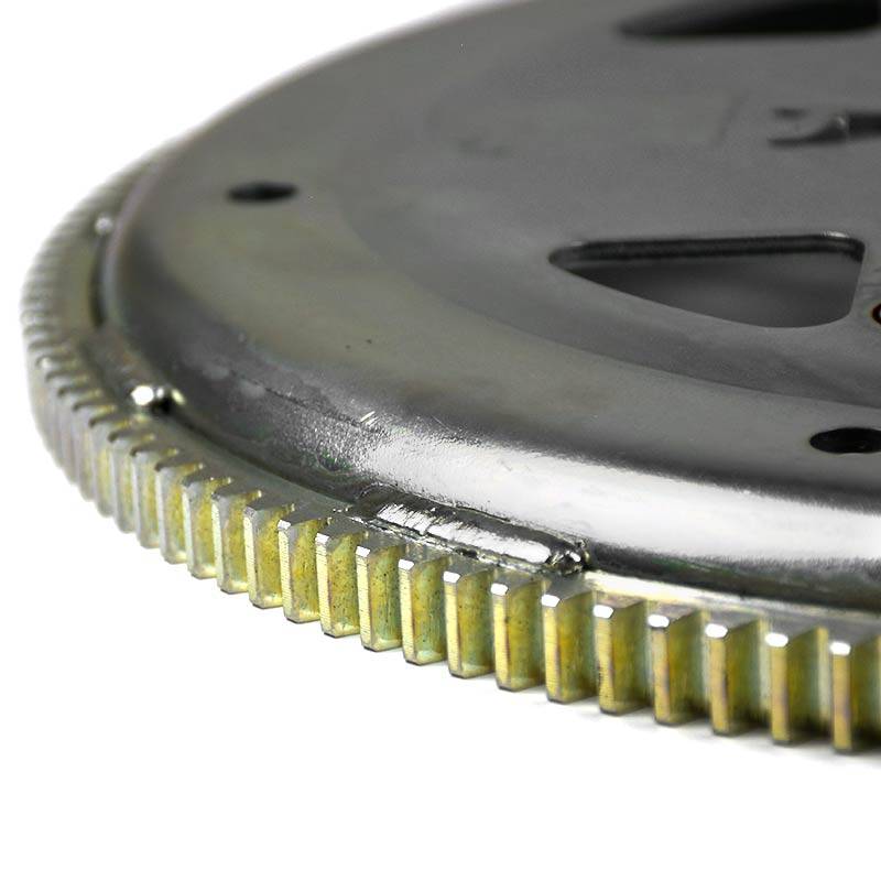 The Stock+ Series Flex Plate features a cold-rolled steel construction with a 4mm thick center plate. This helps provide a more solid foundation and absorbs more stress from the drivetrain compared to the factory flex plate. In addition, the gear ring is robotically cold-welded for accuracy and allows this flex plate to meet SFI specifications.