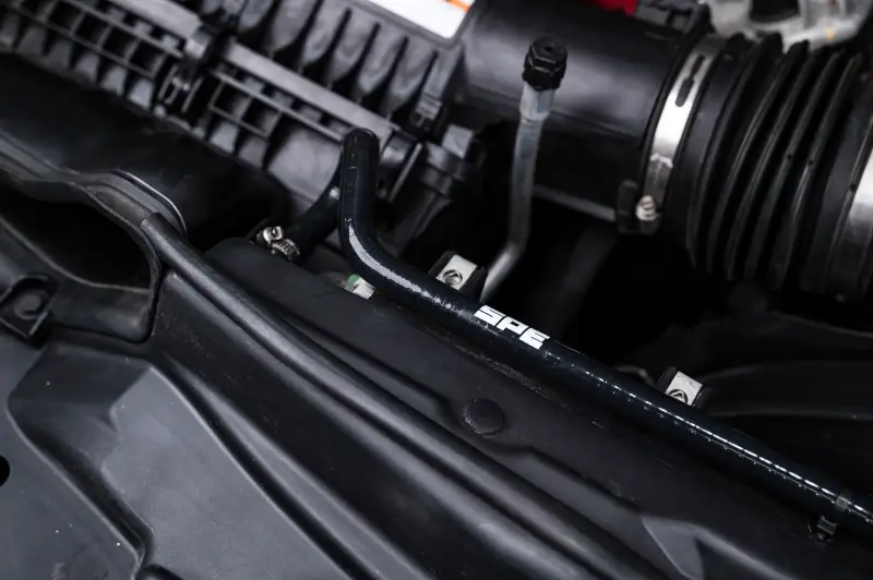 The SPE Motorsport Replacement Coolant Degas Hose Kit is built to solve a common issue on the 2011+ 6.7L Powerstroke: factory degas hoses that crack, leak, and fail under pressure. Anyone who’s worked on these trucks knows the factory hoses don’t stand up to the heat, especially with the factory plastic T’s and brittle EPDM rubber that’s only good for about 250°F. Over time, they break down, causing leaks right on top of the engine, leading to messy, expensive problems.