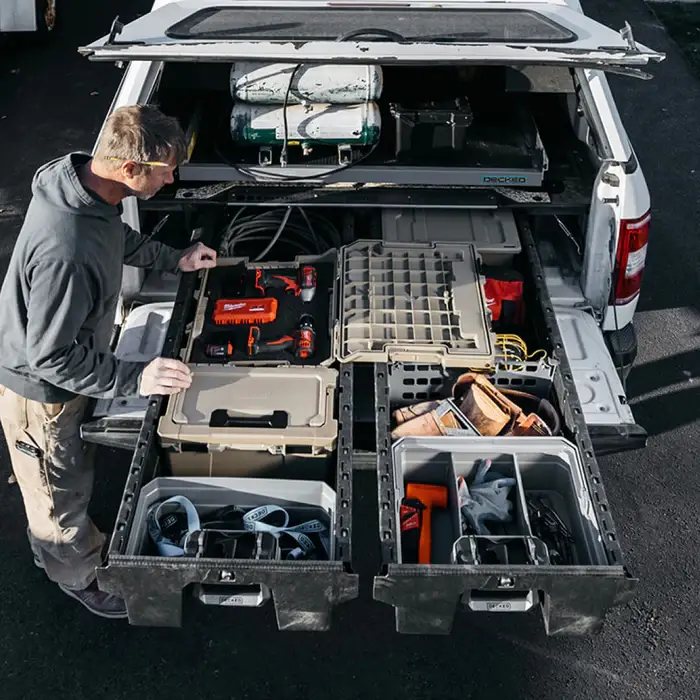 The Drawerganizer is the molded version of ultra-comfy boxer briefs—an accessory that gently cradles all the loose bits rolling around chaotically inside your DECKED drawers. It nests into the handle end of your drawers creating a handy, useful storage space for small tools, hardware, bug spray, duct tape, etc.