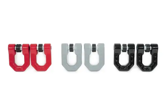 Each set of shackles are sold as a pair and includes (4) ⅛-inch and (4) 3/16-inch isolators. These isolators effectively minimize rattling and movement during driving, keeping your equipment secure and your mind at ease. With a range of options to suit your style, our D-rings are available in black, red, and gray heavy-duty powder coat finishes. Choose the color that perfectly complements your vehicle's body or matches your existing accessories, allowing you to personalize your setup.