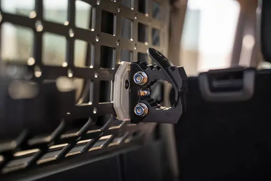 Our Quick Release Tool Mounts offer unlimited solutions for storing tools and equipment on your interior or exterior molle panels. They can be used individually for securing flashlights, recovery gear, tool bags, air inflator/deflator equipment, and other gear; or you can pair them up for mounting long handled tools such as shovels or axes. The mounts feature a quick release for easy access to your equipment. The clamp radius is adjustable from 1 ¼ inches to 1 ⅝ inches for storing various sized accessories, and it rotates at the base for versatile mounting angles.