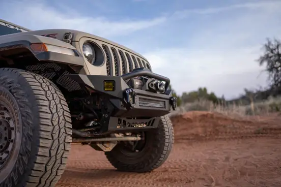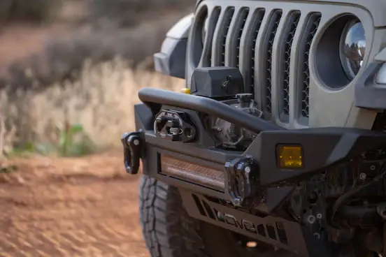 Designed with rock crawling in mind, our Gladiator JT & Wrangler JK/JL Mid-Width Winch Front Bumper boasts a high clearance design. Engineered to perfection and inspired by the classic DV8 FS-7 bumper, this rugged bumper is designed to take your adventure to the next level. Bumper features a recessed winch tray, ensuring your winch stays at a lower profile position. Not only does it provide a sleek and streamlined appearance, but it also accommodates a wide range of winch sizes, making it versatile and adaptable to your needs.