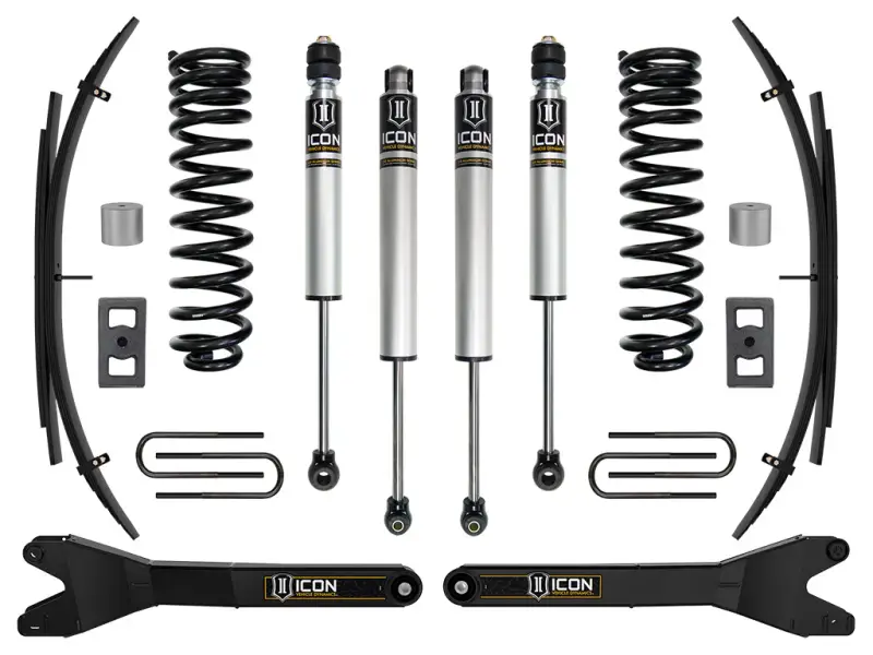 This ICON Vehicle Dynamics 2.5” suspension system is a great way to lift your 4WD 2023-2025 Ford F-250/F-350 Super Duty while drastically improving ride quality and performance. The Stage 1 system is perfect for on-road and light duty off-road use including towing, job site duty and general off-road adventure. ICON's Stage 1 System is comprised of dual rate coil springs optimized for trucks equipped with diesel engines, fabricated radius arms, rear leaf spring expansion packs with blocks and U-bolts for a more compliant ride and reduced axle wrap, and ICON 2.0 Aluminum Series front and rear internal reservoir shocks. This stage sees the inclusion of the ICON Vehicle Dynamics Ford Super Duty Radius Arm System that feature a sealed pivot bushing that minimizes road feedback and ensures a long life and quiet operation. Additionally, their fabricated, fully boxed design ensures strength and utilizes a profile optimized for tire clearance at full steering lock, making a 37” tall tire clear without coming in contact with the radius arm. With the endless hours ICON has spent testing and tuning our suspension components and shocks as a complete package, you can rest assured you have the best suspension solution on the market.