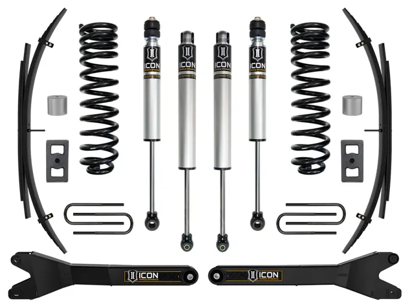 This ICON Vehicle Dynamics 2.5” suspension system is a great way to lift your 4WD 2023-2025 Ford F-250/F-350 Super Duty while drastically improving ride quality and performance. The Stage 1 system is perfect for on-road and off-road use including towing, job site duty and general off-road adventure. ICON's Stage 1 System is comprised of dual rate coil springs optimized for trucks equipped with gasoline engines, fabricated radius arms, rear leaf spring expansion packs with blocks and U-bolts for a more compliant ride and reduced axle wrap, and ICON 2.0 Aluminum Series front and rear internal reservoir shocks. This stage sees the inclusion of the ICON Vehicle Dynamics Ford Super Duty Radius Arm System that feature a sealed pivot bushing that minimizes road feedback and ensures a long life and quiet operation. Additionally, their fabricated, fully boxed design ensures strength and utilizes a profile optimized for tire clearance at full steering lock, making a 37” tall tire clear without coming in contact with the radius arm. With the endless hours ICON has spent testing and tuning our suspension components and shocks as a complete package, you can rest assured you have the best suspension solution on the market.