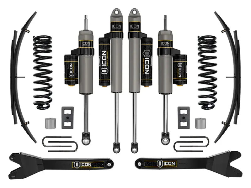 This ICON Vehicle Dynamics 2.5” suspension system is a great way to lift your 4WD 2023-2025 Ford F-250/F-350 Super Duty while drastically improving ride quality and performance. The Stage 2 system is perfect for on-road and off-road use including towing, job site duty and general off-road adventure. ICON's Stage 2 System is comprised of dual rate coil springs optimized for trucks equipped with gasoline engines, fabricated radius arms, rear leaf spring expansion packs with blocks and U-bolts for a more compliant ride and reduced axle wrap, and ICON 2.5 Aluminum Series front and rear piggyback reservoir shocks. This stage sees the inclusion of the ICON Vehicle Dynamics Ford Super Duty Radius Arm System that feature a sealed pivot bushing that minimizes road feedback and ensures a long life and quiet operation. Additionally, their fabricated, fully boxed design ensures strength and utilizes a profile optimized for tire clearance at full steering lock, making a 37” tall tire clear without coming in contact with the radius arm. With the endless hours ICON has spent testing and tuning our suspension components and shocks as a complete package, you can rest assured you have the best suspension solution on the market.