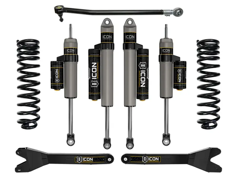 This ICON Vehicle Dynamics 2.5” suspension system is a great way to lift your 4WD 2023-2025 Ford F-250/F-350 Super Duty while drastically improving ride quality and performance. The Stage 3 system is perfect for on-road and off-road use including towing, job site duty and general off-road adventure. ICON's Stage 3 System is comprised of dual rate coil springs optimized for trucks equipped with diesel engines, fabricated Radius arms, on-vehicle adjustable front track bar, and ICON 2.5 Aluminum Series front and rear piggyback reservoir shocks. This stage sees the inclusion of the ICON Vehicle Dynamics Ford Super Duty Radius Arm System that feature a sealed pivot bushing that minimizes road feedback and ensures a long life and quiet operation. Additionally, their fabricated, fully boxed design ensures strength and utilizes a profile optimized for tire clearance at full steering lock, making a 37” tall tire clear without coming in contact with the radius arm. With the endless hours ICON has spent testing and tuning our suspension components and shocks as a complete package, you can rest assured you have the best suspension solution on the market.