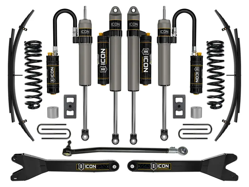 This ICON Vehicle Dynamics 2.5” suspension system is a great way to lift your 4WD 2023-2025 Ford F-250/F-350 Super Duty while drastically improving ride quality and performance. The Stage 4 system is perfect for on-road and off-road use including towing, job site duty and general off-road adventure. Also included in this stage is ICON's CDC Valve front and rear shocks, for those desiring an easy way to tune the ride externally with 10 settings, from soft to hard. ICON's Stage 4 System is comprised of dual rate coil springs optimized for trucks equipped with diesel engines, fabricated radius arms, on-vehicle adjustable front track bar, rear leaf spring expansion packs with blocks and U-bolts for a more compliant ride and reduced axle wrap, and ICON 2.5 Aluminum Series CDCV remote reservoir front and CDCV piggyback reservoir rear shocks. This stage sees the inclusion of the ICON Vehicle Dynamics Ford Super Duty Radius Arm System that feature a sealed pivot bushing that minimizes road feedback and ensures a long life and quiet operation. Additionally, their fabricated, fully boxed design ensures strength and utilizes a profile optimized for tire clearance at full steering lock, making a 37” tall tire clear without coming in contact with the radius arm. With the endless hours ICON has spent testing and tuning our suspension components and shocks as a complete package, you can rest assured you have the best suspension solution on the market.