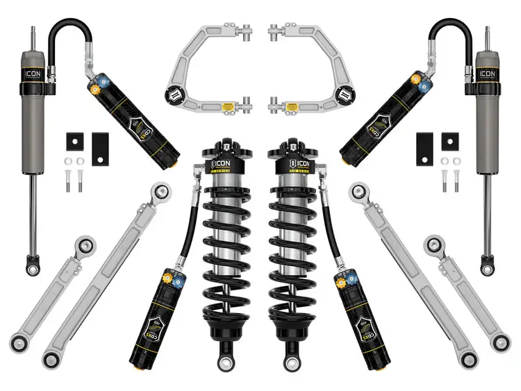 The ICON Vehicle Dynamics Stage 1 3.0 complete suspension system for the 2022-2025 Toyota Tundra builds upon the Stage 10 2.5 suspension system with the upgrade to 3.0 Series front coilovers. To compliment the 3.0 Series coilover shocks, 2.5 Aluminum Series CDXS rear remote reservoir shocks are included along with billet aluminum front upper control arms and a billet rear upper/lower link combo, and a front sway bar drop kit. This system offers improved on- and off-road performance with adjustable compression damping, as well as improved alignment specs and increased front-end lift height range for a proper stance and fitment of up to 35" tires.