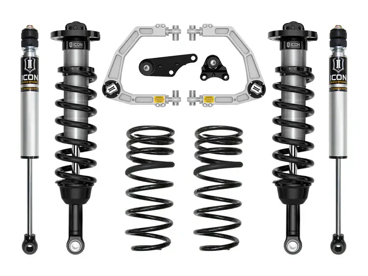 ICON Vehicle Dynamics 2024-2025 Toyota Tacoma suspension systems are designed with maximum performance and the serious driver in mind. ICON engineers’ primary focus is to increase wheel travel and damping ability, which translates into outstanding vehicle control and ride quality both on- and off-road. This Stage 2 system includes vehicle-specific tuned 2.5 Series coilover shocks featuring internal reservoirs for exceptional cooling properties and ICON-engineered coil springs for superior vehicle “feel” through the range of travel. These coilovers are height adjustable from 1.25-3” of front lift height over stock, allowing the use of larger, more aggressive wheel and tire combinations. The combination of front differential drop brackets and ICON’s specifically designed coilover lengths maximizes the available front suspension travel and prevent CV bind. Additionally, polyurethane differential mounting bushings replace the soft OE bushings to help limit differential movement under load. The ICON billet aluminum upper control arm kit is designed to improve the overall performance of the new 2024-2025 Toyota Tacoma with corrected front-end geometry, increased on-vehicle camber and caster adjustment, and improved suspension component clearance. Replacing the OE ball joint with the all-new, serviceable, and rebuildable ICON Delta Joint PRO allows for full bump and droop travel of the front suspension while eliminating bind.
