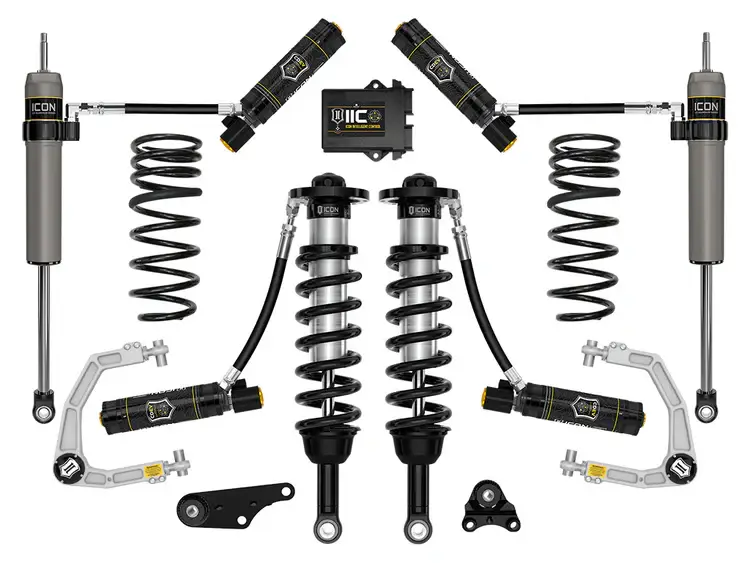 ICON Vehicle Dynamics 2024-2025 Toyota Tacoma suspension systems are designed with maximum performance and the serious driver in mind. ICON engineers’ primary focus is to increase wheel travel and damping ability, which translates into outstanding vehicle control and ride quality both on- and off-road. This Stage 6 system includes vehicle-specific tuned 2.5 Series coilover shocks featuring CDEV equipped remote reservoirs and ICON-engineered coil springs for superior vehicle “feel” through the range of travel. Remote reservoirs greatly increase shock oil volume and heat dissipation surface area to resist overheating and cavitation under hard use, which can lead to damper fade. Focus on driving and let ICON Intelligent Control (IIC) read the terrain and make near-instant adjustments via the Compression Damping Electronic Valve (CDEV) at each individual shock. Control the system wirelessly through the IIC app on your phone and once configured the system functions without driver input. These coilovers are also height adjustable from 1.25-3” of front lift height over stock, allowing the use of larger, more aggressive wheel and tire combinations. The combination of front differential drop brackets and ICON’s specifically designed coilover lengths maximizes the available front suspension travel and prevent CV bind. Additionally, polyurethane differential mounting bushings replace the soft OE bushings to help limit differential movement under load.