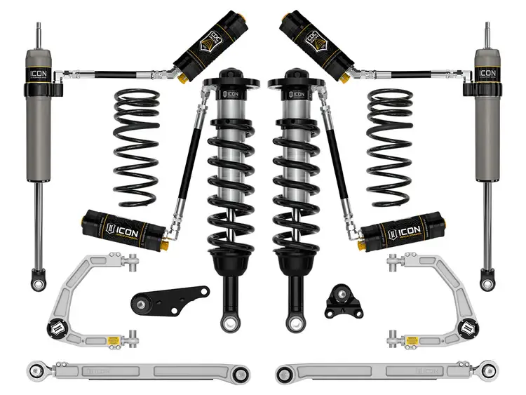 ICON Vehicle Dynamics 2024-2025 Toyota Tacoma suspension systems are designed with maximum performance and the serious driver in mind. ICON engineers’ primary focus is to increase wheel travel and damping ability, which translates into outstanding vehicle control and ride quality both on- and off-road. This Stage 8 system includes vehicle-specific tuned 2.5 Series coilover shocks featuring CDCV equipped remote reservoirs and ICON-engineered coil springs for superior vehicle “feel” through the range of travel. Remote reservoirs greatly increase shock oil volume and heat dissipation surface area to resist overheating and cavitation under hard use, which can lead to damper fade. The included ICON CDC Valves are externally adjustable valves that restricts oil flow into the reservoir which creates 10 levels of compression damping force ranges. These coilovers are also height adjustable from 1.25-3” of front lift height over stock, allowing the use of larger, more aggressive wheel and tire combinations. The combination of front differential drop brackets and ICON’s specifically designed coilover lengths maximizes the available front suspension travel and prevent CV bind. Additionally, polyurethane differential mounting bushings replace the soft OE bushings to help limit differential movement under load.
