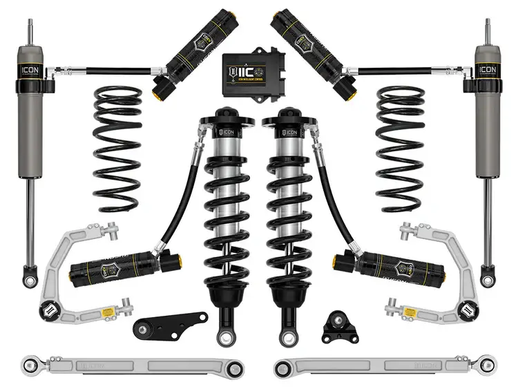 ICON Vehicle Dynamics 2024-2025 Toyota Tacoma suspension systems are designed with maximum performance and the serious driver in mind. ICON engineers’ primary focus is to increase wheel travel and damping ability, which translates into outstanding vehicle control and ride quality both on- and off-road. This Stage 10 system includes vehicle-specific tuned 2.5 Series coilover shocks featuring CDEV equipped remote reservoirs and ICON-engineered coil springs for superior vehicle “feel” through the range of travel. Remote reservoirs greatly increase shock oil volume and heat dissipation surface area to resist overheating and cavitation under hard use, which can lead to damper fade. Focus on driving and let ICON Intelligent Control (IIC) read the terrain and make near-instant adjustments via the Compression Damping Electronic Valve (CDEV) at each individual shock. Control the system wirelessly through the IIC app on your phone and once configured the system functions without driver input. These coilovers are also height adjustable from 1.25-3” of front lift height over stock, allowing the use of larger, more aggressive wheel and tire combinations. The combination of front differential drop brackets and ICON’s specifically designed coilover lengths maximizes the available front suspension travel and prevent CV bind. Additionally, polyurethane differential mounting bushings replace the soft OE bushings to help limit differential movement under load.