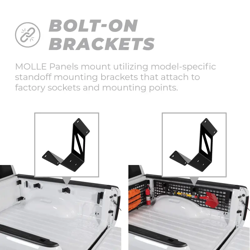 •Complete Coverage: Outfit your truck with MOLLE panels for the front bulkhead, driver side, passenger side, and tailgate. Choose individual panels or a complete kit for full bed organization and protection.