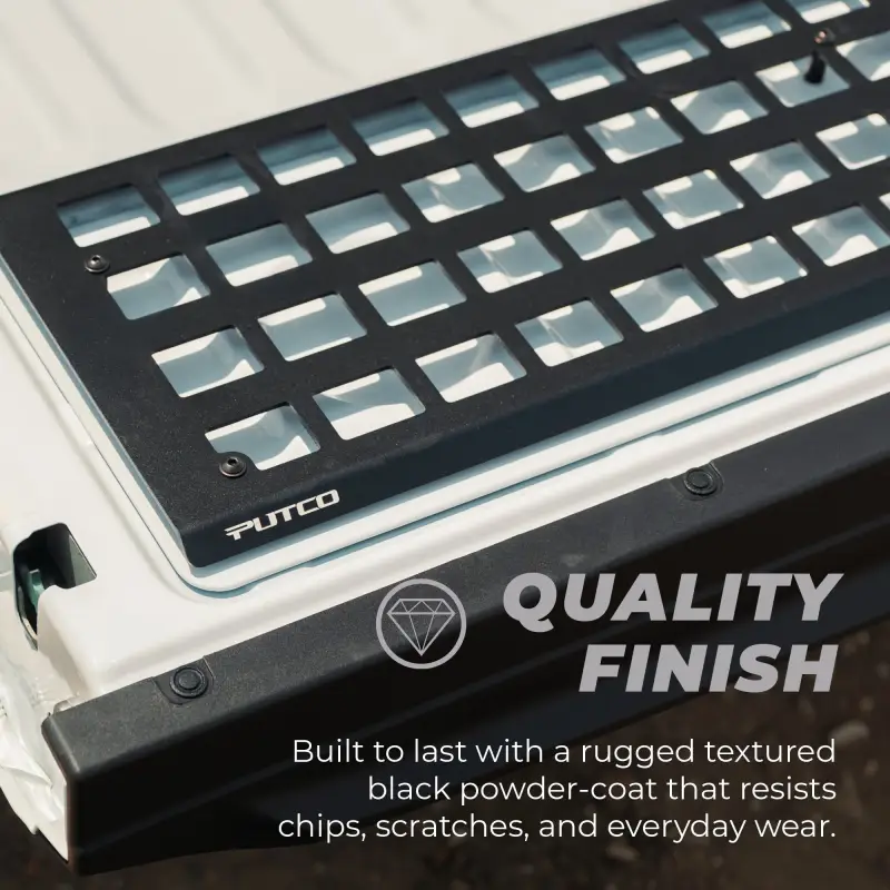 Secure your truck-bed cargo with Putco’s MOLLE Truck Bed Panels – a premium modular storage system for your truck bed. Designed from genuine OEM CAD, Putco’s MOLLE system is ideal for keeping your gear organized and accessible throughout your journey – whether you’re heading to the worksite, on an overland excursion, tailgating, or running everyday errands. Available for the bulkhead, driver side, passenger side, tailgate, or a full kit. Putco offers rack configurations ranging from individual panels to full systems. Putco MOLLE Panels provide versatile mounting options for your gear, tools, and other essentials, keeping them protected and within reach.