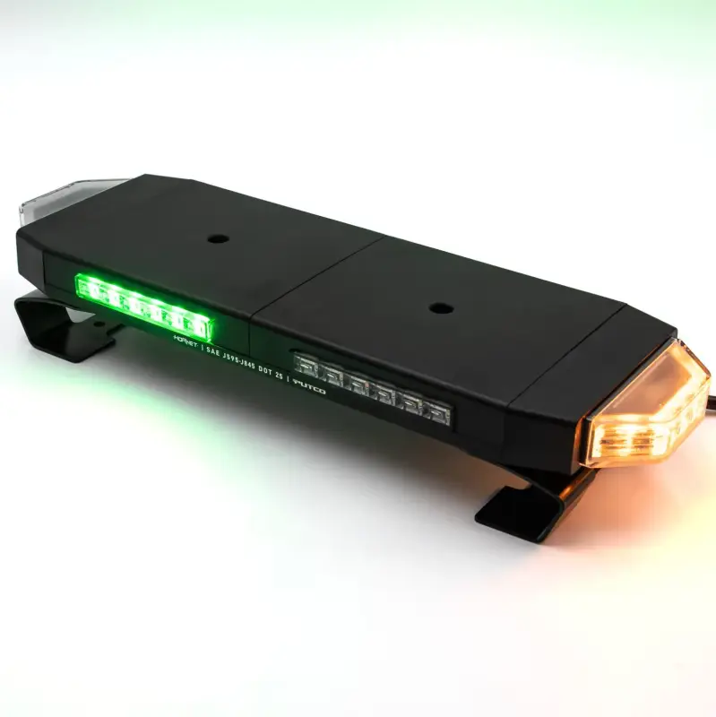 Its triple-color output sets the Green Hornet apart; choose from green, white, or amber strobe patterns, or configure a combination that suits your application. Whether you’re coordinating a construction zone, responding to roadside emergencies, or enhancing visibility for snow removal, the Green Hornet offers high-impact signaling in any environment. These roof top or headache rack strobe lights are great for security vehicles, contractors, emergency vehicles and more.
