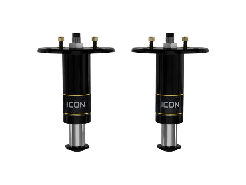 While the factory rear bump stops do a satisfactory job of absorbing impacts on a street driven truck, ICON found that there was much room for improvement during spirited driving in rough, off-road terrain. The ICON Vehicle Dynamics 2021-2024 Ram 1500 TRX and 2025-2026 Ram 1500 RHO Rear Hydraulic Bump Stop System was designed to take the off-road capability of the truck to new levels by significantly improving the bottom-out control of the rear suspension and reducing rear end kick. Like all ICON hydraulic bumps stops, these feature both velocity and position sensitive technology which means that as the shaft speed increases and moves through the travel, the damping force increases exponentially to provide excellent bottoming resistance that won’t negatively affect articulation. This system features 2.5” diameter, one-piece impact extruded and hard anodized aluminum bump stop bodies with an internal reservoir design for improved damping and more consistent, predicable performance than 2.0” diameter, emulsion style bump stops. To compliment the larger body diameter, these bump stops also incorporate heavy duty 1.625” diameter hardened chrome plated shafts.