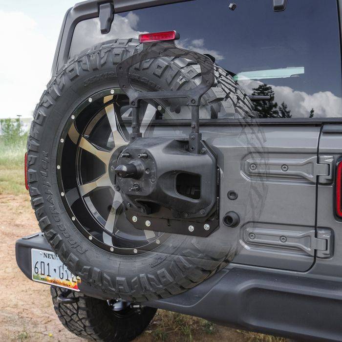 Available for 2018-2025 Jeep JL Wrangler - Rubicon, Sport & Sahara models. Provides 2.5" up and 1" outward change in mounting location. Allows you to safely carry up to 35" tall off-road tires. Retains use of the factory third brake light. Heavy-duty laser cut and precision welded construction. Easy bolt-on installation that uses the factory carrier mounting locations. Made in USA.