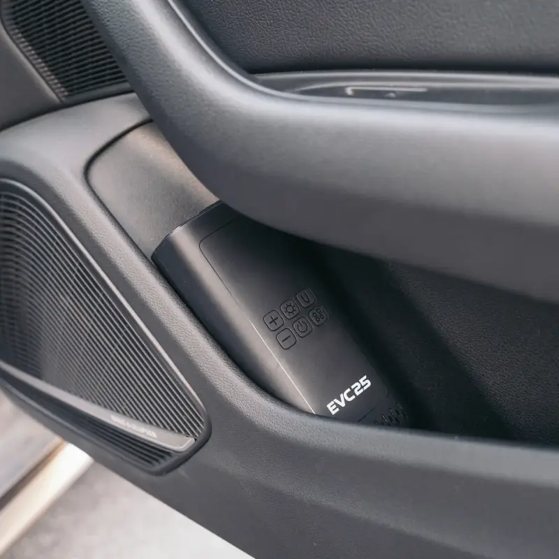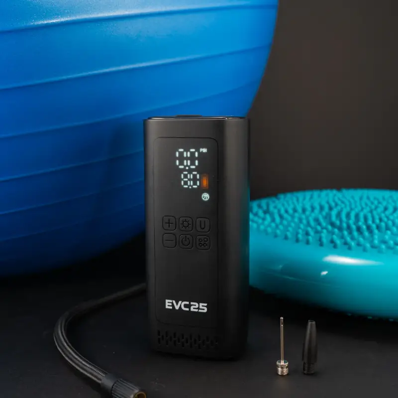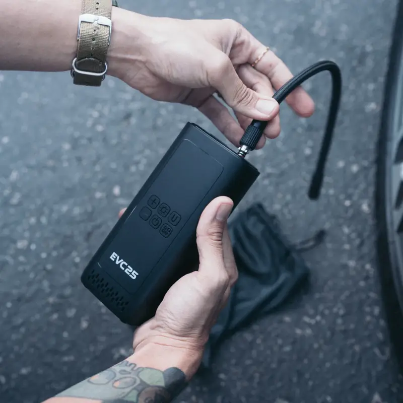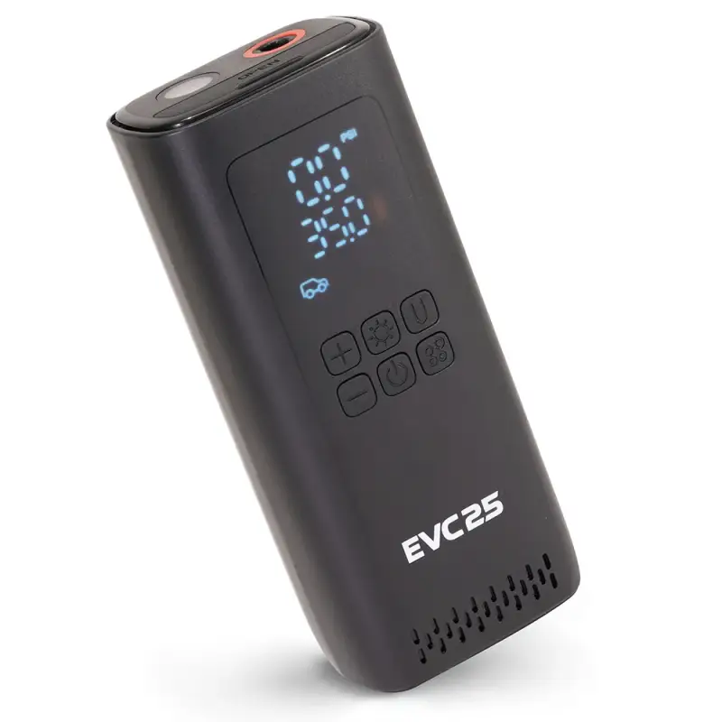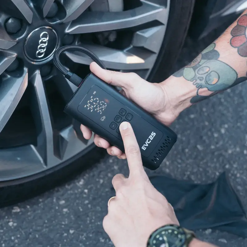 The EVC25 is an all-in-one air solution that’s perfect for your car, bike, motorcycle, or inflatables. This wireless compressor operates with 2 x 2000mAh batteries with capabilities of reaching 150 PSI. Multifunction with smart auto preset pressure, a digital screen, and large buttons. The EVC25 features multiple inflation modes and comes standard with a built-in power bank feature. Keep it in your glove box or under your seat - this portable tire inflator is a must-have for every vehicle.