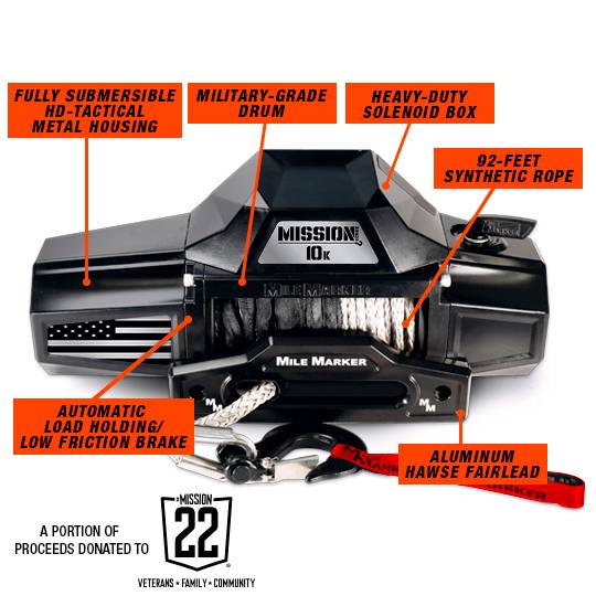 Built for strength, precision, and pride, the Mile Marker Mission Series Winch Flag Edition combines rugged performance with patriotic spirit. Engineered for reliability in the harshest conditions, it delivers unmatched pulling power and control. Whether tackling trails, work sites, or recovery missions, this winch stands ready—power, durability, and heritage in one. Mile Marker is pleased to have partnered with Mission 22, a national community that stands beside our Veterans and their families. A portion of the proceeds for every Mission Flag Series winch will be donated to Mission 22 as a token of our gratitude for these heroes and their families.