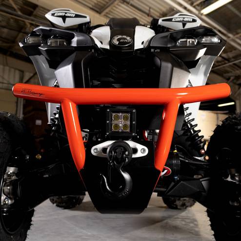 The HMF HD Front Bumper for the Can-Am® Renegade is built from .095" steel tubing, fits up to a 3500 lb winch, and is a durable, lightweight front bumper that's ideal for riders looking to add front end protection without a lot of weight. The HD Front Bumper works with ATV Fairleads that have 4-7/8" hole spacing, with room to install a 4" LED Square Light in the center. With great aesthetics and increased functionality, the Front Bumper makes for an incredible addition to the front of the Renegade.