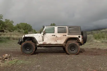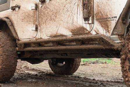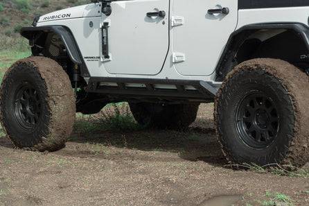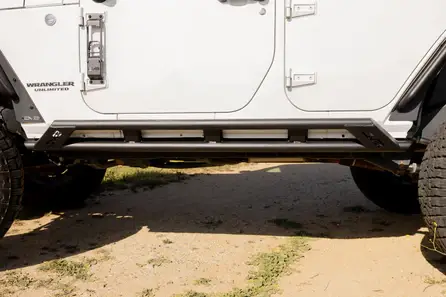 Our Jeep JK Rock Sliders are built to shield your Wrangler’s rocker panels from trail damage. Constructed from heavy-duty .160-wall steel tubing, the dual 2-inch tube design is engineered to handle hard impacts with rocks, roots, and other obstacles that would otherwise damage factory body panels. The high-clearance profile keeps the sliders tucked tight to the body, helping maintain ground clearance and allowing the Jeep to slide over obstacles instead of hanging up on them. Boxed ends add additional strength and a clean, finished appearance.